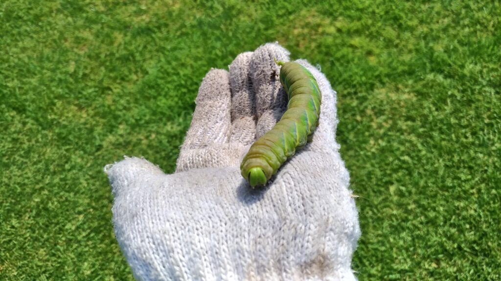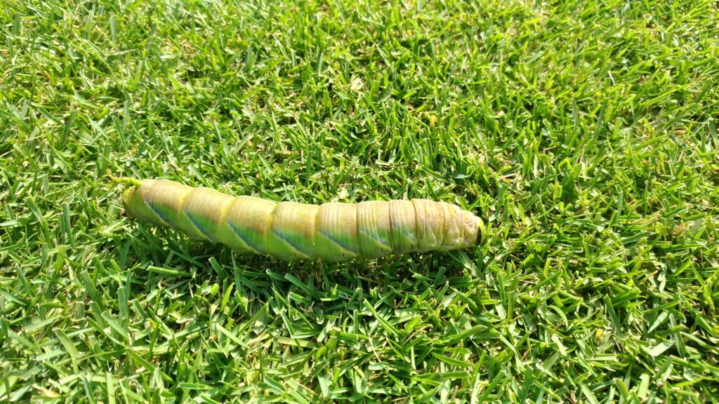 体長12cmもある珍しいクロメンガタスズメという蛾の幼虫です